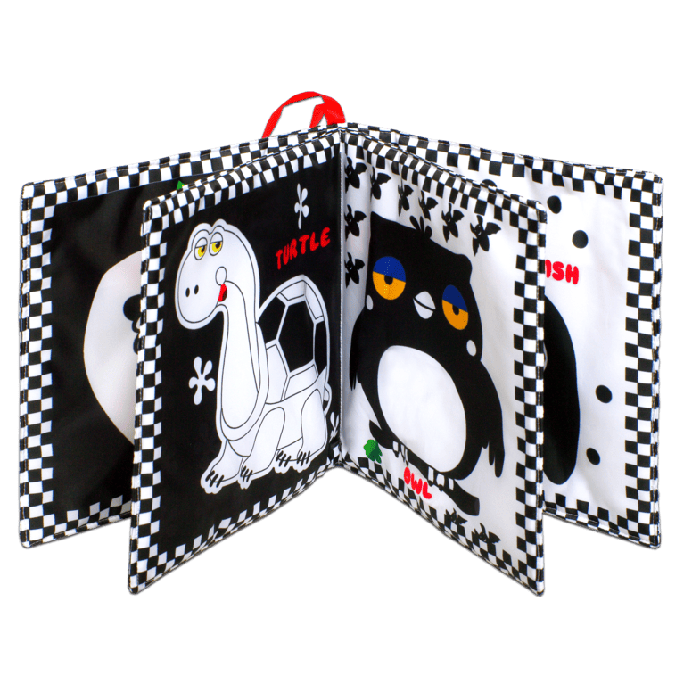 Великі , кольорові сторінки ,виготовленні з м'якої тканини , приємної на дотик ,а зображення кумедних тваринок привертають увагу та стимулюють зореве сприйняття . У середині однієї зі сторінок , сховано пищалку ,що розвиває слух та допомагає дитині вчитися причино -наслідковим зв'язкам .